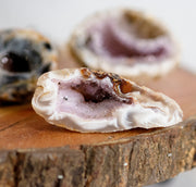 Oco geodes are known for their beautiful, sparkling crystals, which can be found in a range of colors, including purple, green, and yellow. The most common type of crystal found in oco geodes is quartz, although other minerals such as calcite, amethyst, and agate can also be found. Oco geodes are often sliced open to reveal the crystals inside, and they are sometimes polished to create a smooth, shiny surface.