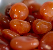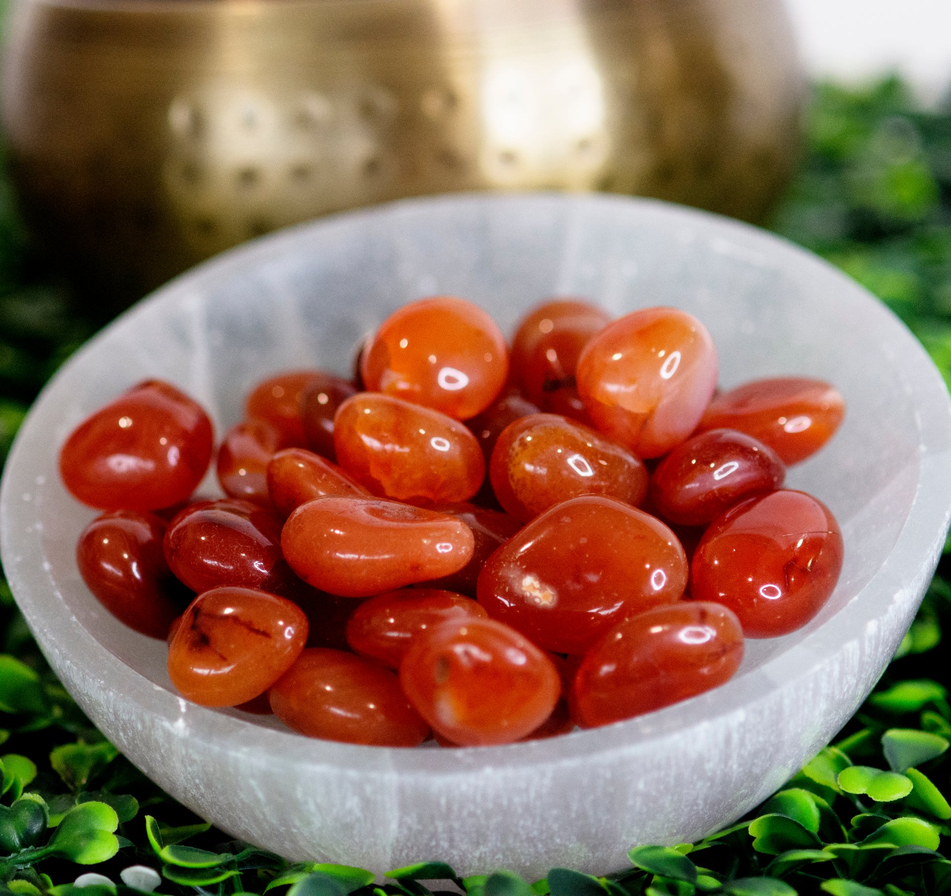 Carnelian, a sacral chakra stone, encourages security, safety, courage, willpower and determination. It assists in cleansing the negativity from other stones, and may not need cleansed as often. Carnelian crystal is a warm, vibrant stone that boosts confidence and the power of true expression, courage and self-confidence. Carnelian calms anger and grounds one in reality, keeping one focused on the here and now and not on past experiences. Carnelian can enhance vitality and will, providing the higher energy needed when approaching new projects and dreams.