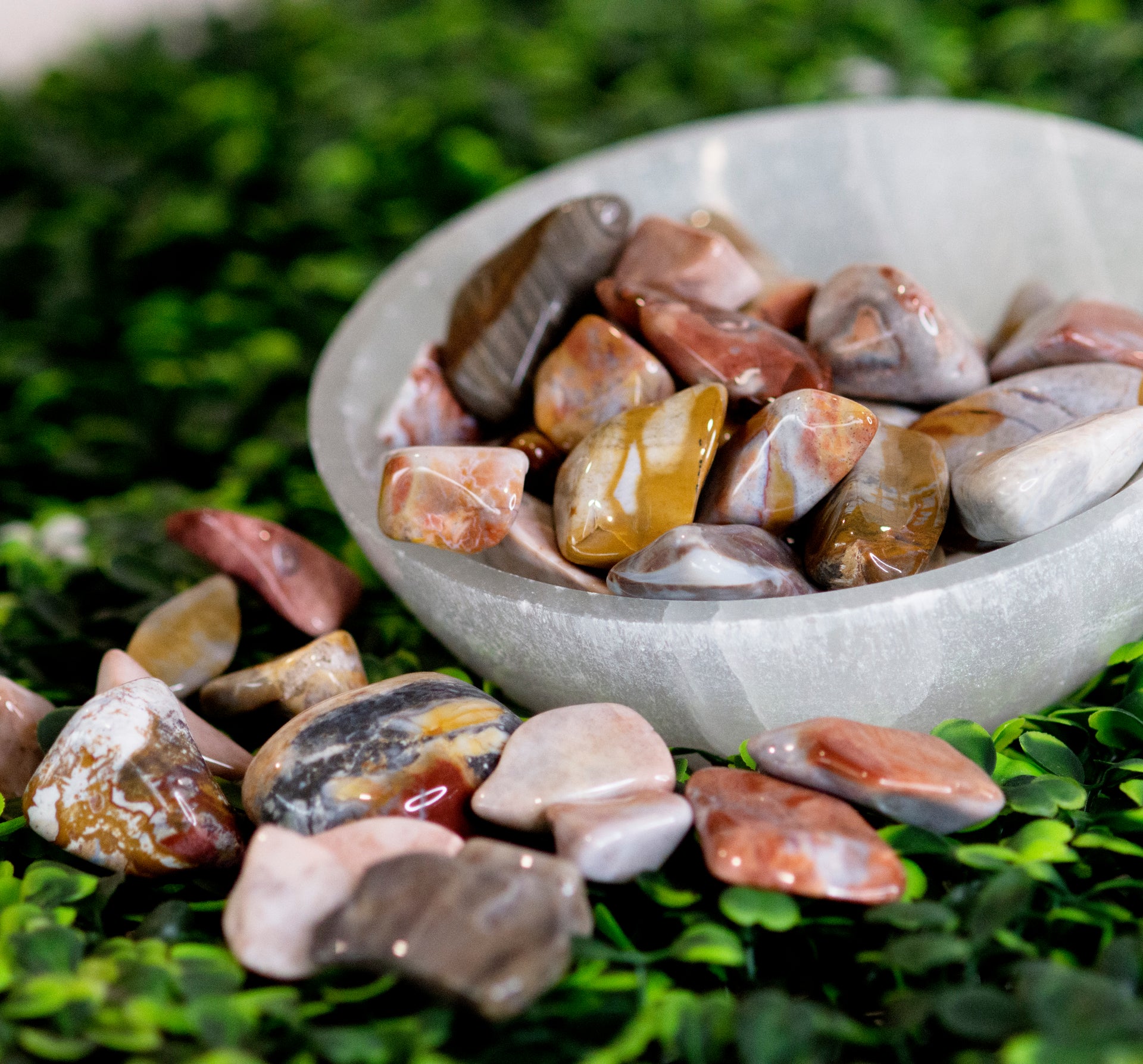Flint tumble stones are often used as decorative elements in home decor, such as in vases or as part of a rock garden. They may also be used in various forms of crystal therapy, where they are believed to have healing properties. Some people believe that flint has grounding and protective properties, and that it can help to bring clarity and focus to the mind. It is also sometimes believed to have energetic properties that can help to balance the chakras and promote overall well-being.
